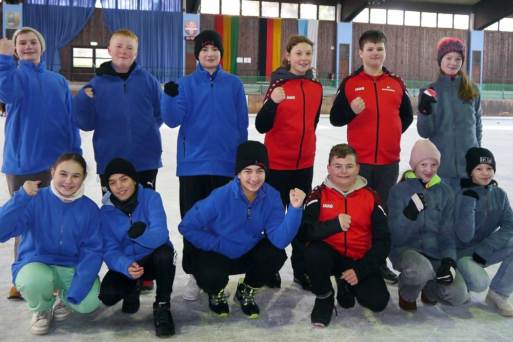 Gleich viermal Grund zum Jubeln gab bei der Schüler U 14, wo vier Teams den Aufstieg erreichten – von links die beiden Vertretungen des ESV Mitterskirchen, der SC Reicheneibach und der EC Wilhelmshöhe – hinten von links Markus Joachimbauer, Maxi Eder, Samuel Hahn, Eva Kreuzeder, Johannes Wintermeier und Johanna Attenberger- vorne von links Christina Eder, Korbinian Hahn, Daniel Rettenböck, Alexander Hagl, Leonie Attenberger und Anna Huber