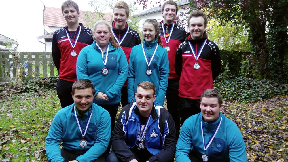 Silber und Bronze gab es bei der Bezirksmeisterschaft U19 im Stockschießen für den SC Reicheneibach (in rot) und den DJK SV Wittibreut (in blau): Stehend von links Andreas Stelzig, Selina Weiß, Vinzent Steckermeier, Sandra Thalbauer, Christoph Sedlmaier und Michael Hamann. Knieend von links Florian Wimmer, Noel Sabo und Markus Mühlstraßer.