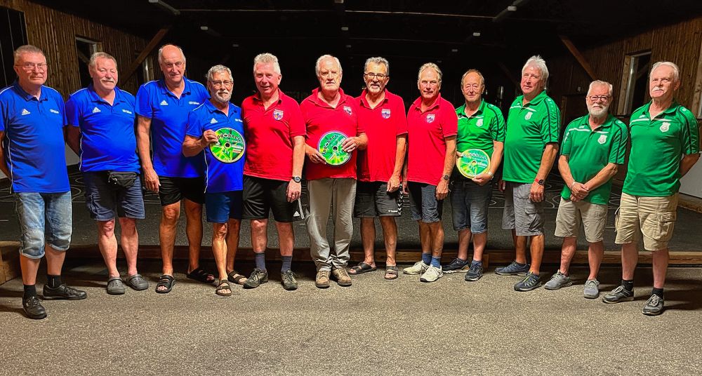 Die drei besten Formationen bei der Ü 60 Kreismeisterschaft – von links der SSV Nöham mit die Ludwig Stütz, Siegfried Dickl, Manfred Dellerer und Franz Bauer der EC Irging Simbach mit Gottfried Bauer, Rudi Ostwinkl, Werner Huber und Hans Spateneder und der DJK-SV Wittibreut mit Englbert Landschützer, Rudolf Roiter, Rudolf Müller und Hans Mailhammer.