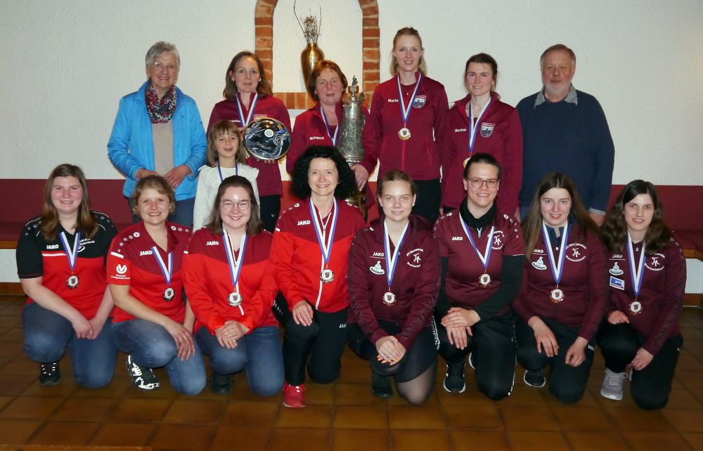 Siegerehrung der Damen- hinten von links: stellvertretende Landrätin Edeltraud Plattner, Christina Hofmann, Hildegard Spielbauer, Marie Luise Spielbauer, Marion Neubauer und Kreisobmann Ernst Hecht – vorne von linksder SSV Dietersburg mit Maria Brandstetter, Agnes Schernhammer, Magdalena Weigl und Marion Ulrich sowie der SV Gumpersdorf mit Uschi Zerbin, Maria Empl, Anna Hinteraicher und Regina Brandmüller