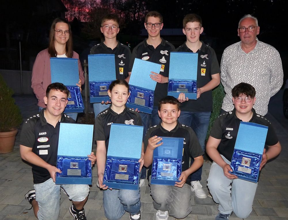 Einmal mehr war die Stockschützen national und international erfolgreich. Anlässlich der Frühjahrsversammlung wurden die erfolgreichen Sportler geehrt. Hinten von links: Maria Empl, Johannes Leibinger, Florian und Martin Kreuzeder sowie Kreisobmann Bernhard Stelzig – vorne von links Marco Straubinger, Eva Kreuzeder, Alexander Hagel und Lukas Hanseder