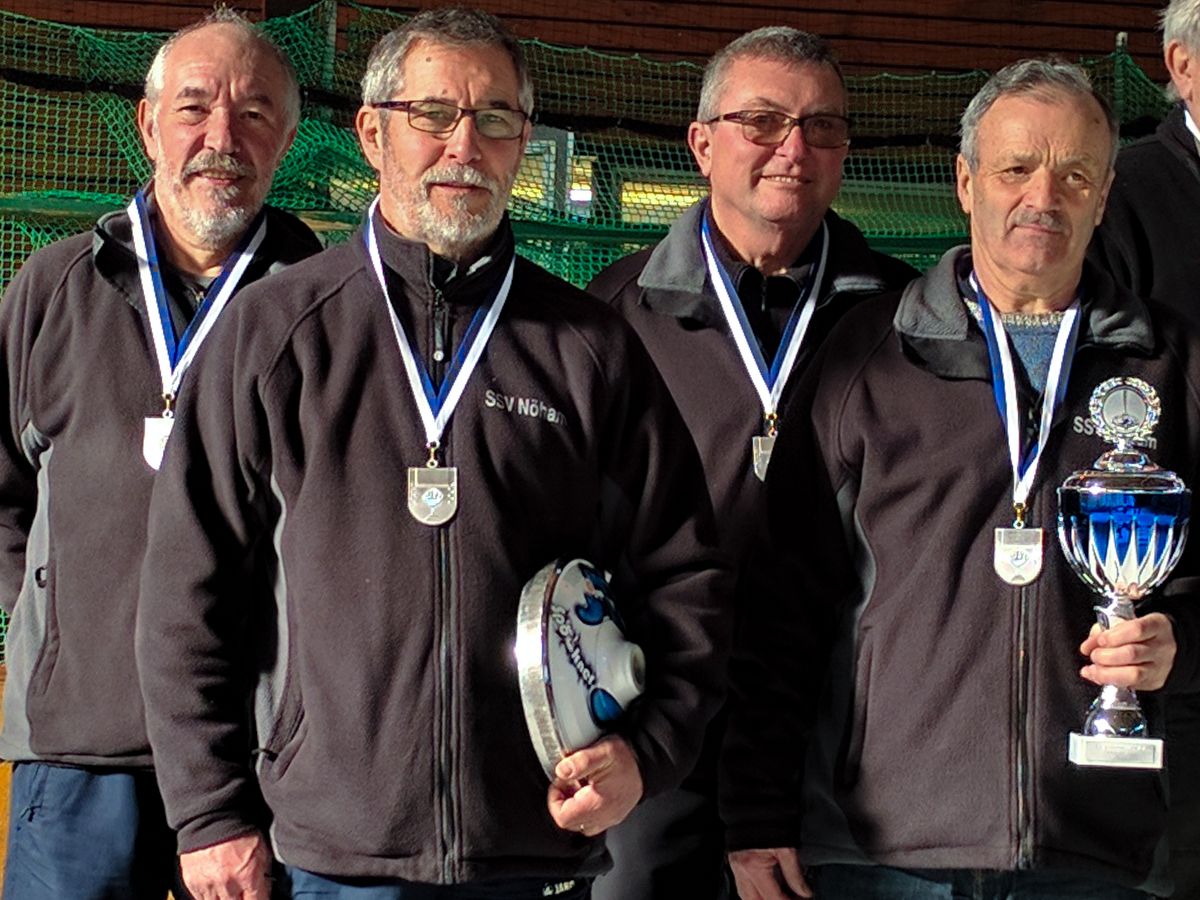 Sehr positiv überraschten in der Karolihalle von Waldkirchen auch die Ü60 Herren des SSV Nöham mit Franz Bauer, Siegfried Schmied, Franz Gisnapp und Ludwig Stütz. Nach zwei klaren Auftaktniederlagen gegen Stockschützen Rottenburg (3:21) und TSV Preying (7:33) war das Kapitel bayerische Titelkämpfe so gut wie erledigt. Mit einer grandiosen Aufholjagd und fünf Siegen in Folge kämpfte sich das Quartett vom letzten Gruppenplatz auf den Ersten, punktgleich mit den Stockschützen Rottenburg (10:4). Siege gab es gegen TSV Schönberg (28:0), Kreisauswahl 107 (14:6), Kreisauswahl 105 (22:10), TSV Nittenau (12:8) und ESC Kandlarn (21:3). Die bessere Stocknote von 1,925 gegenüber 1,443 brachte daher die Teilnahme am Finale gegen die Kreisauswahl 104. Mit 5:19 zog man allerdings den Kürzeren und jubelten trotzdem über den bayerischen Vizetitel. Bei den alten Herren Ü60 ist dies der hochrangigste Wettbewerb. (gh)