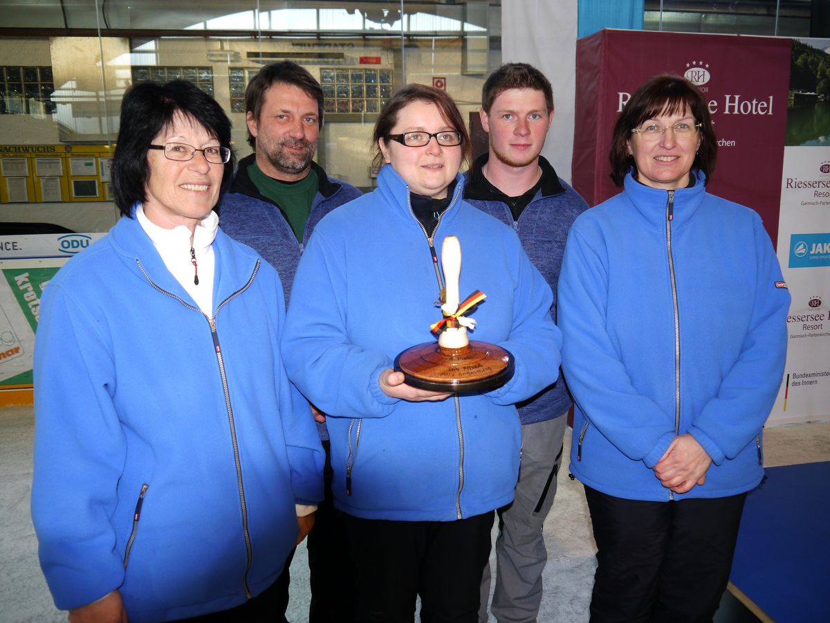 Sportlich vorzuwerfen hatten sich Thomas Schmuderer, Jürgen Rothaler, Ulli Waschlinger, Renate Schreiner und Marianne Hahn nach den insgesamt elf Begegnungen in keiner Phase der Titelkämpfe etwas. Nach fünf Auftaktsiegen gegen den TUS Engelsberg II 16:8, ESC Langenargen 30:6, EHC Freiburg 29:5, TSV Ismaning 13:9 und RSV Büblingshausen 17:15 war man mit 10:0 Punkten voll im Soll beim Kampf um die Medaillen. Auch eine 6:24 Niederlage gegen den späteren deutschen Meister EC Passau Neustift brachte das Team nicht aus dem Konzept und mit weiteren Siegen gegen den ES Sollingen 28:12 und EC Krefeld II 23:13 wurde der zweite Gruppenplatz gefestigt. Nach einer 11:15 Niederlage gegen den FC Untertraubenbach wurde es nochmal eng um die Spitzenplätze, aber ein 33:3 Sieg in der Abschlusspartie gegen Stuttgart-Vaihingen/Neuenstadt ergab mit 16:4 Punkten Gruppenplatz zwei hinter dem überragend aufspielenden Passau Neustift, der keinen Punkt in der Gruppe an die Gegner abgab. Schnell erledigt war dann der Kampf um die drei Podestplätze in der Halbfinal-Qualifikationsrunde durch ein 12:18 gegen den TUS Engelsberg. Deutscher Meister wurde schließlich der EC Passau Neustift mit einem 13:9 über den TSV Hartpenning. Platz drei ging an den TUS Engelsberg, der die Qualifikation zum Finale mit 6:22 gegen den TSV Hartpenning verlor. (gh)