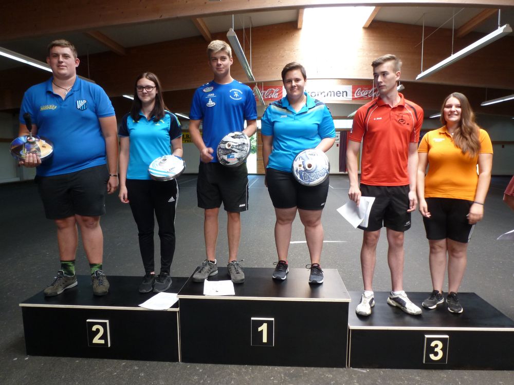 Siegerehrung U 19: von links Daniel Steber , Annalena Preis, Stefan Empl SV Gumpersdorf, Katharina Riepl, Michael Stelzig SC Reicheneibach und Elisabeth Poidl TSV Massing