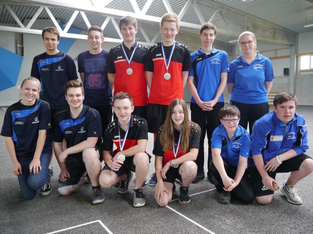 Sie spielen bei der Bayerischen Meisterschaft um die Startplätze zur Deutschen Meisterschaft. Links der EC Wilhelmshöhe mit in der Mitte der SC Reicheneibach und rechts der ESV Mitterskirchen. Hinten von links Matthias Huber, Lukas Koppermüller, Andreas Stelzig, Vincent Steckermaier, Mathias Hahn und Elisabeth Dirnberger. Vorne von links Anna Maria Haberzagl, Nico Tändler, Michael Haman, Anna Hinteraicher, Michael und Lorenz Zanklmaier.